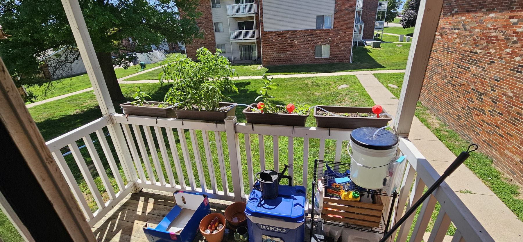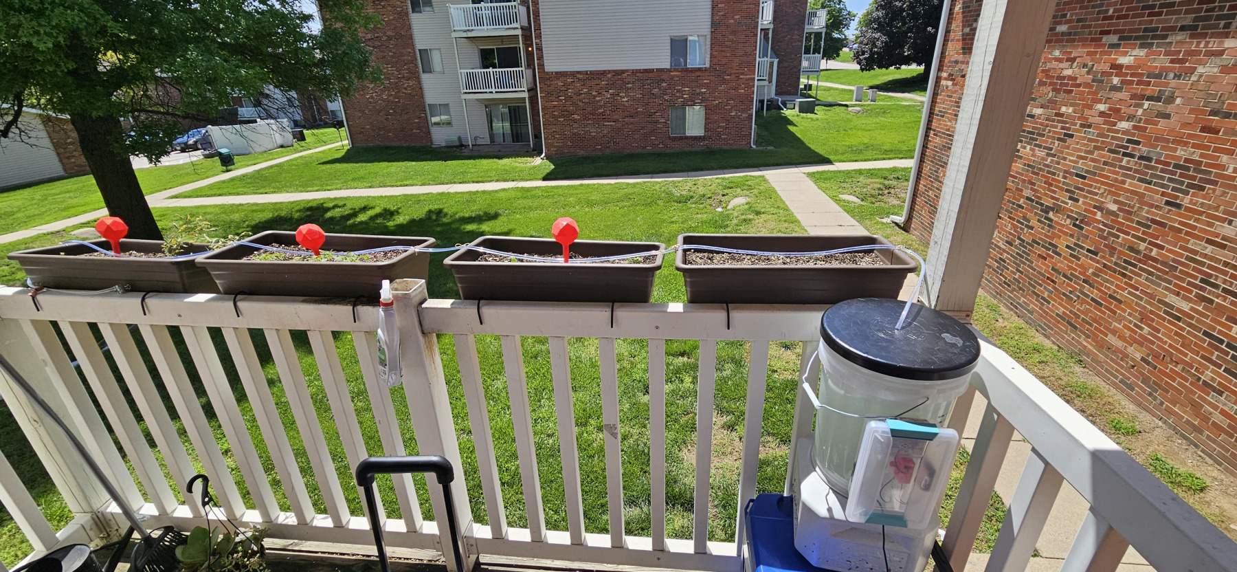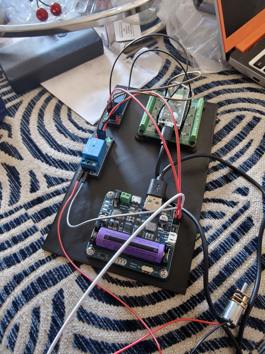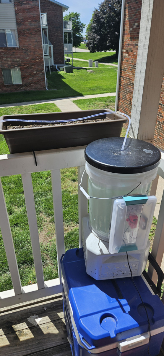 The first version of my automated watering system was basic but surprisingly effective. I repurposed an old Raspberry Pi 2 B to control a 5V relay via the GPIO pins, which toggled a small fish tank pump at set times of the day. The pump sat at the bottom of a 5-gallon bucket and pushed water through a 3/8″ tube. I had pinched the end of the tube shut and drilled holes along its length to create a DIY sprinkler. All of this was controlled by a Python program I wrote and setup as a service so it always ran. I could also SSH and send a command to get it to run for an extra cycle if it was a rather dry day.